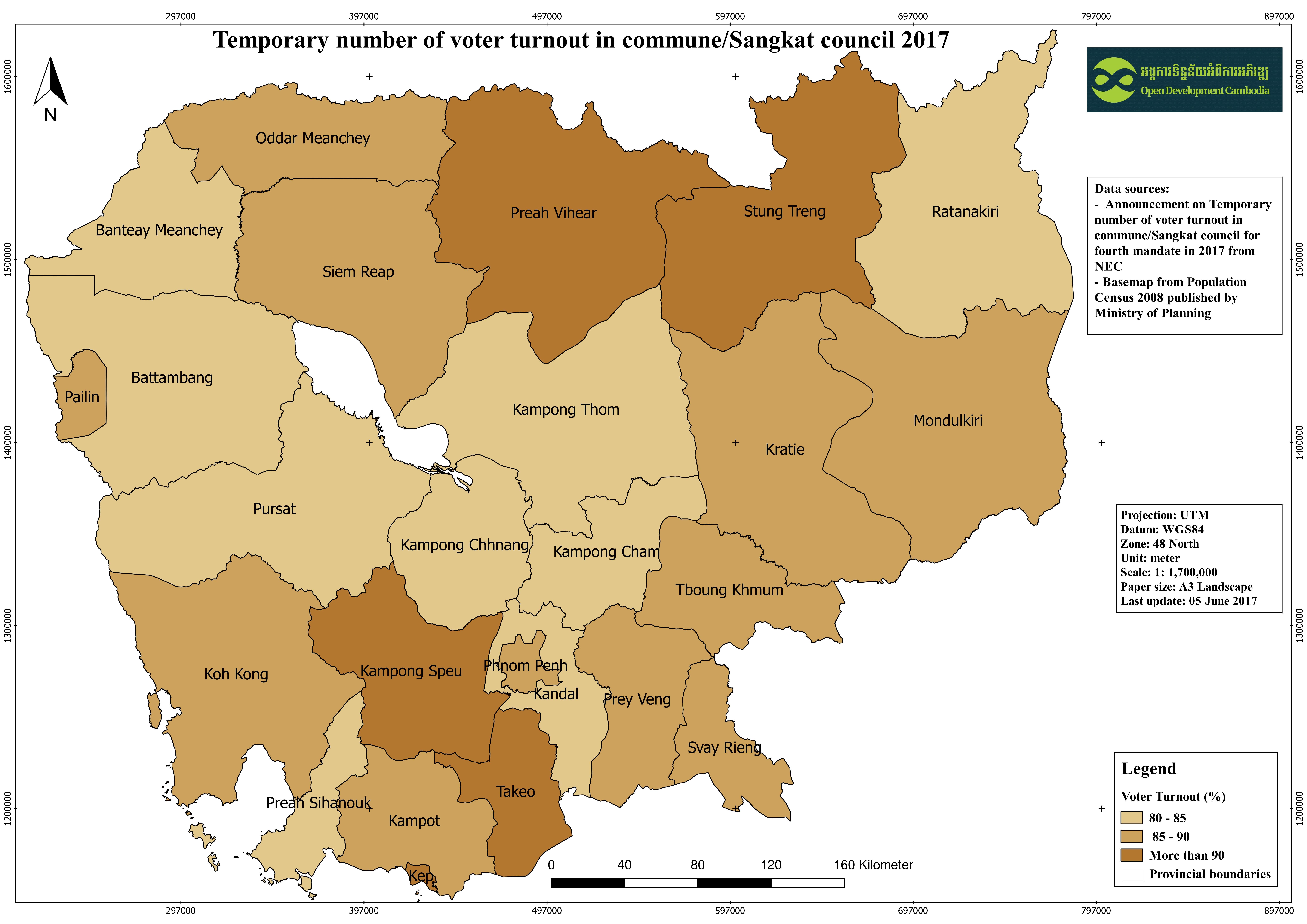 | Completeness | The temporary number of voter turnout in the commune election for the 4th legislature was published by National Election Committee (NEC) on 05 June 2017, and aggregated by ODC from the authentic source. |